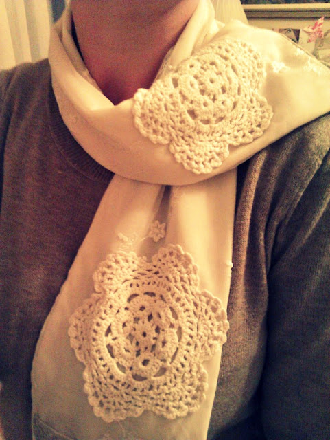 Hello my lovelies! I'm sorry for the silence on my part, but this week has been a testing one! Life does sometimes throw one a curve ball (or three), and then all good intentions and productivity flies out the window! Anyhow, I did finally manage to do a little sewing today, albeit a 'quickie' project. In all honesty, this little project was all I could muster today! I think you all know by now that I am madly in love with lace and doilies...yes, I too have been converted to granny chic. So, today I decided to use both to make a scarf. A bit of lace for romance, teamed up with some cute doilies, and that's how you marry romance and granny chic!