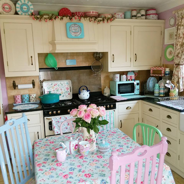 The walls in the kitchen have been looking a little tired, a faded blue that made me feel a little blue too! I have been threatening to paint it pink for months, and well, all I can say is...PINK!!! It is very pink now, but I absolutely love it! The table and chairs are finished too, in various shades of pastels. It feels very cheery in here now!