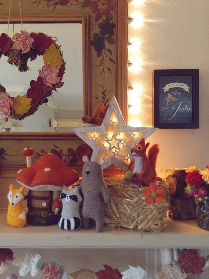Now, I am really just a five year old in the body of a nearly 40 year old...yikes...that's a somewhat sobering thought! I love whimsical things, so this year there are a few old favourite forest creatures on the mantel...some handmade by me, and some collected over the years...I have teamed these up with my favourite autumn flourishes, a bouquet of Physalis and Asters. I love the bright, cheerful tones of these, and together with a few red berries it is the epitomy of fall. A few years ago, I made a wreath and leafy fabric garland. These come out every year to announce autumn's arrival. It's a it of a tradition now. As it's the first day of autumn, I thought I'd share some snaps. Do you indulge in a little seasonal decorating too? I'd love to hear from you! Here's to cosy days and woolly jumpers!
